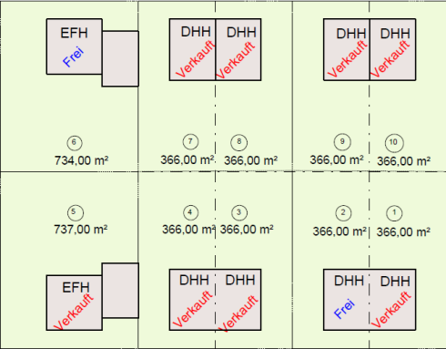 Die Doppelhaushälften Parzelle 1, 3, 4, 7, 8, 9 und 10 sowie das Einfamilienhaus Parzelle 5 sind verkauft.